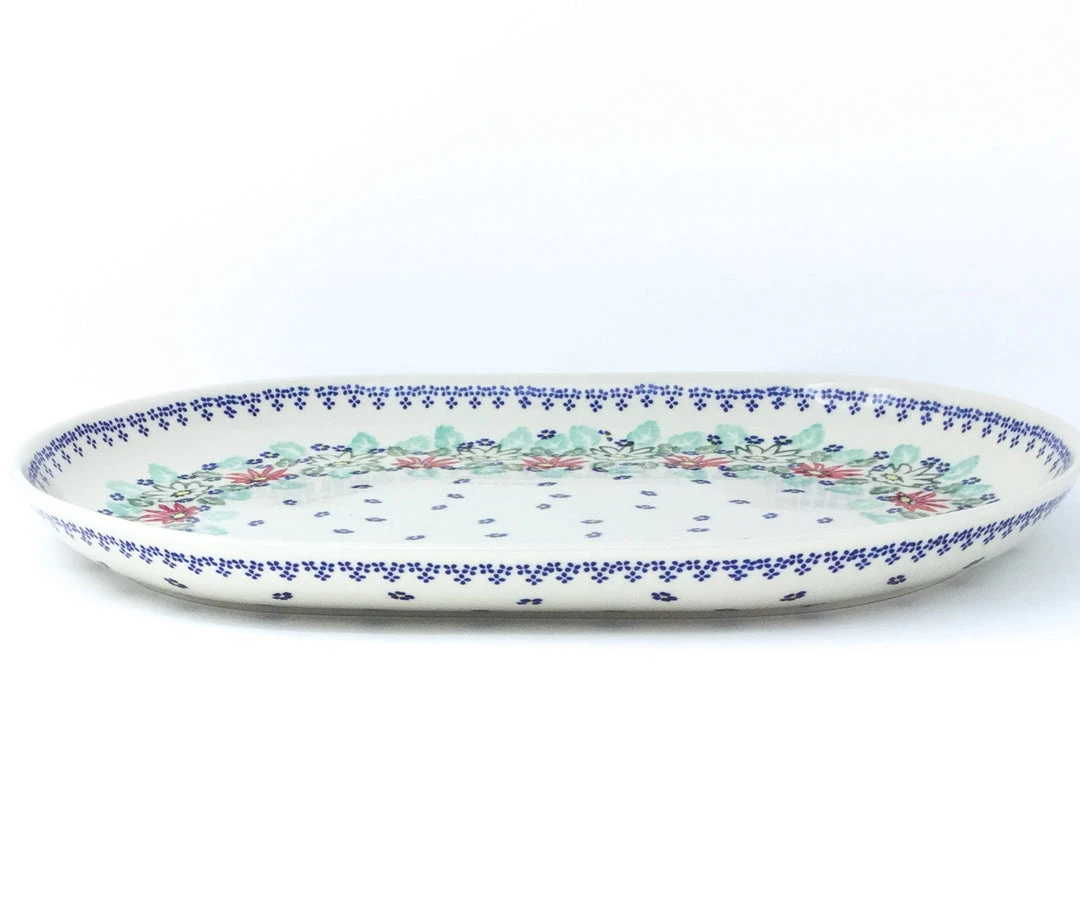 Polish Pottery Ex Lg Oval Platter 17.5″ (P-092) Beautiful server for cheese, vegetables, fruit, and much more Dimensions Length 17.5 inches Features Dishwasher safe Oven safe Microwave safe Freezer safeDimensions (in inches):