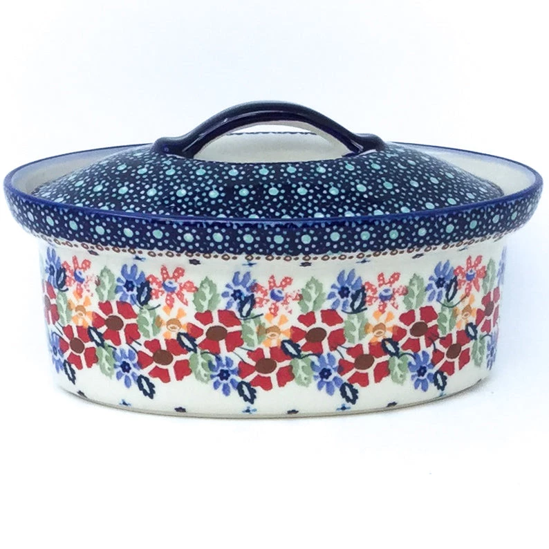 Gorgeous small oval server with cover. Ideal for serving side dishes, appetizers, and dips. Can be used to keep dishes hot or chilled.