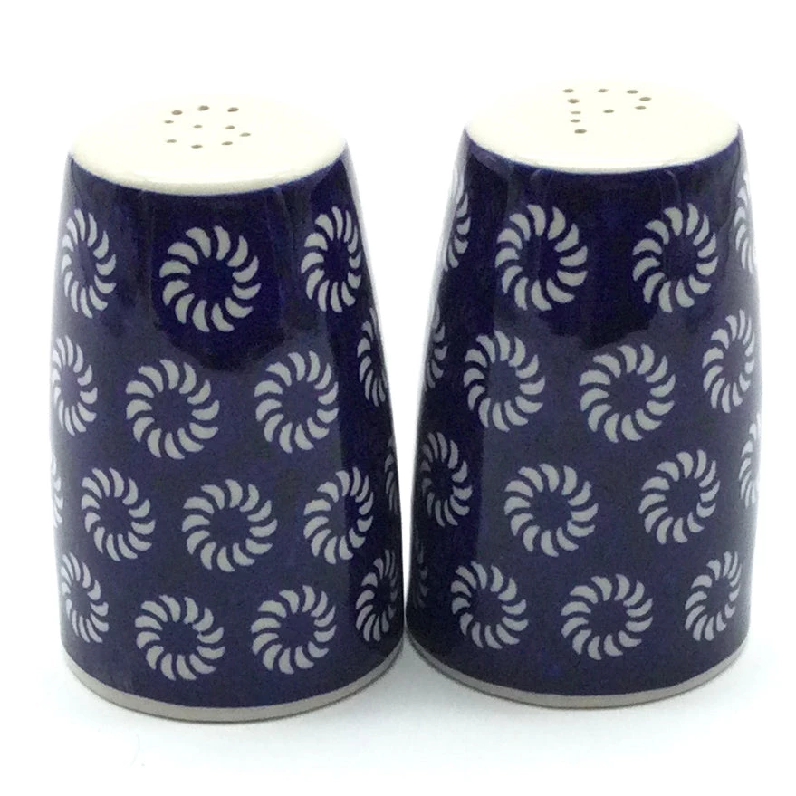 Polish Pottery Salt & Pepper Set (S-086) Beautiful additional to your dinner table, or practical addition to your kitchen accessory Dimensions Diameter 1 inch Hight 4 inches Features Dishwasher safe Oven safe Microwave safe Freezer safeDimensions (in inches):