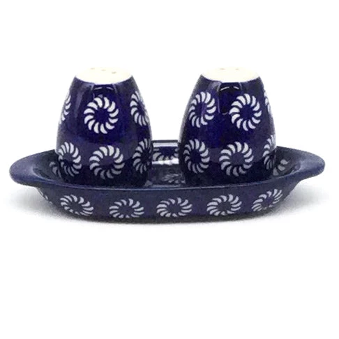 Polish Pottery Salt & Pepper Set w/Tray (S-079) A beautiful addition to any table and kitchen Dimensions Length 4 inches Width 1 inches Features Dishwasher safe Oven safe Microwave safe Freezer safeDimensions (in inches):