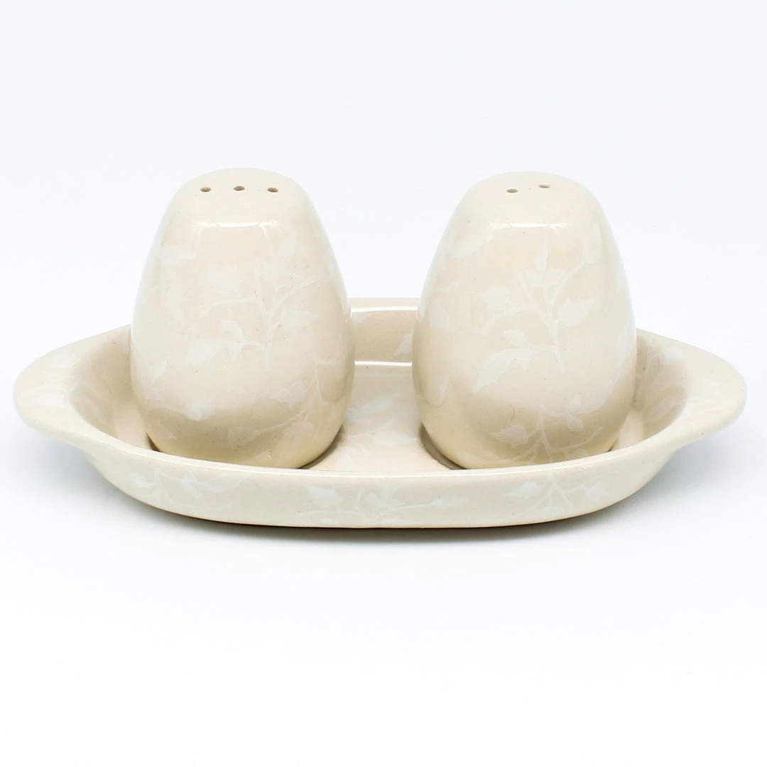 Polish Pottery Salt & Pepper Set w/Tray (S-079) A beautiful addition to any table and kitchen Dimensions Length 4 inches Width 1 inches Features Dishwasher safe Oven safe Microwave safe Freezer safeDimensions (in inches):