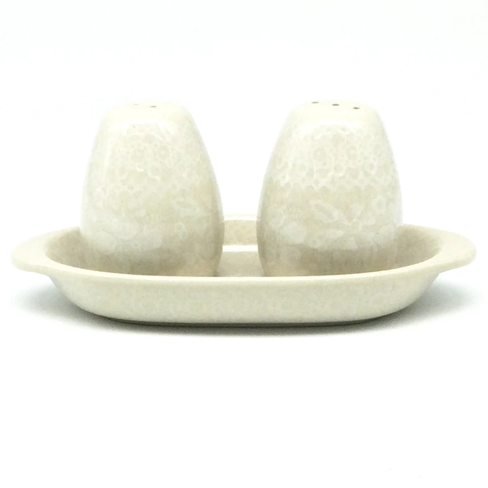 Polish Pottery Salt & Pepper Set w/Tray (S-079) A beautiful addition to any table and kitchen Dimensions Length 4 inches Width 1 inches Features Dishwasher safe Oven safe Microwave safe Freezer safeDimensions (in inches):
