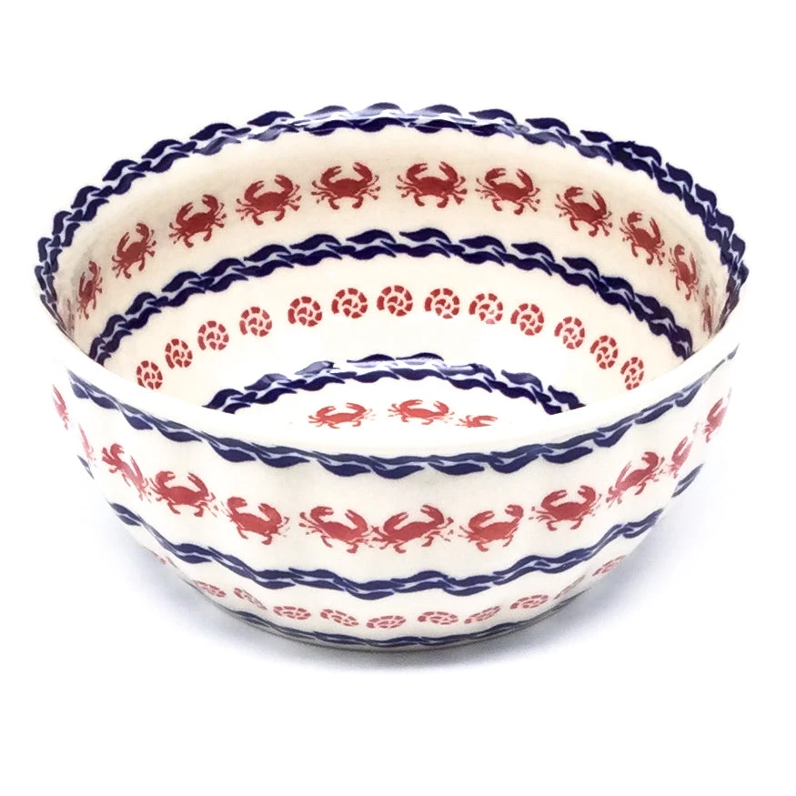 Polish Pottery Scalloped Bowl 48 oz. (M-085) Perfect for serving chips, or side dishes Dimensions Volume 48 oz Features Dishwasher safe Oven safe Microwave safe Freezer safeDimensions (in inches):