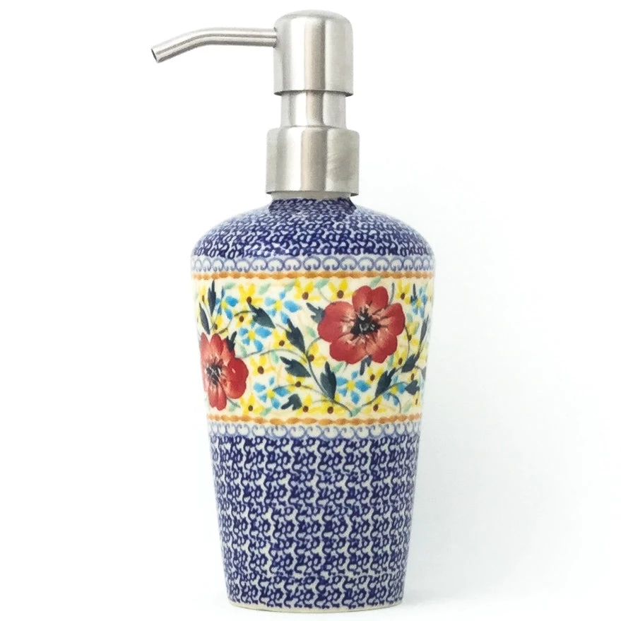 Polish Pottery Soap Dispenser (B-009) Beautiful in any bathroom, or kitchen Dimensions Diameter 3 inches Hight 7 inches Features Dishwasher safe Oven safe Microwave safe Freezer safeDimensions (in inches):